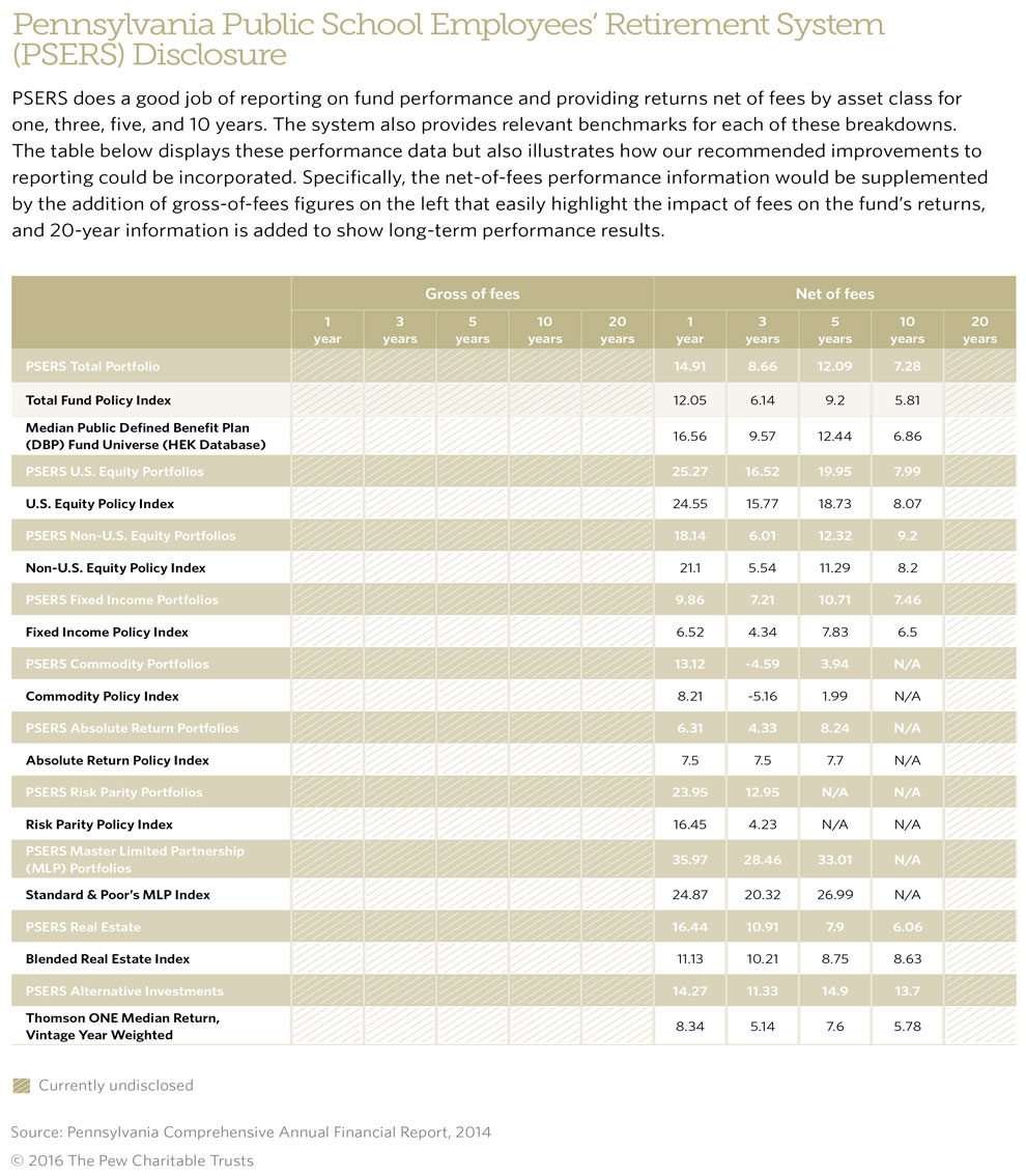 While the performance of individual asset classes may vary over the short term, long-term performance data must be available to assess the overall success of the investment strategy. Further, disclosure of performance both gross and net of fees by asset class would provide stakeholders with bottom-line results and a clearer picture of the cost of implementing the investment strategy identified in fund policy. (See Appendix A for an illustration of how the current reporting for the Pennsylvania Public School Employees’ Retirement System could be improved to include this additional information.)