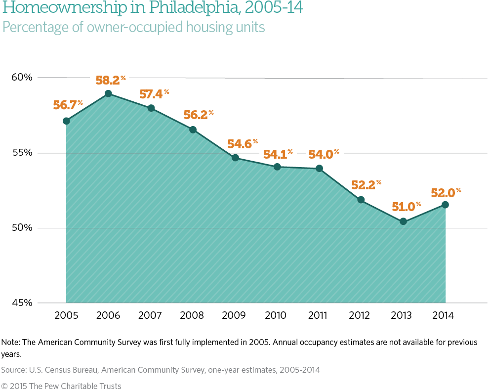 In July 2014, we published a report documenting the decline of homeownership in Philadelphia over the previous decade. At the time, the findings indicated that the city—long known as a place of homeowners—might be on the verge of seeing a majority of residents becoming renters. Analysis of the latest data from the U.S. Census’ American Community Survey, however, suggests that this trend may have stalled.