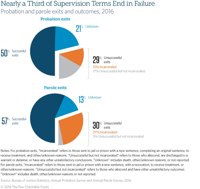 About half of people who complete probation or parole terms do so successfully. But for nearly a third, supervision ends in failure and too often leads to jail or prison. In 2016, 29 percent of the almost 2 million probation exits and 30 percent of roughly 425,000 parole exits were unsuccessful, with 12 percent and 27 percent, respectively, resulting in incarceration. All told, nearly 350,000 individuals on supervision were sent to a jail or prison in 2016.
