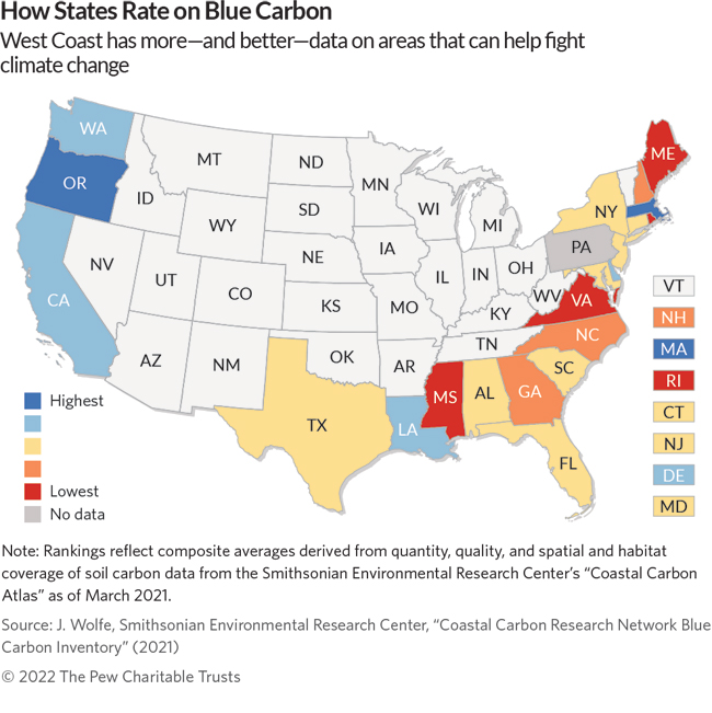 Because states in the U.S. largely set the policies governing their coastlines, they have opportunities to prominently incorporate blue carbon into their climate policies and goals. And because officials increasingly realize the role quality data plays in determining how much blue carbon is contained in their coastal habitats, including salt marshes, forested tidal wetlands, mangroves, and seagrass beds, The Pew Charitable Trusts recently hosted a webinar that brought together experts from two organizations focused on collecting blue carbon data and making it readily available.