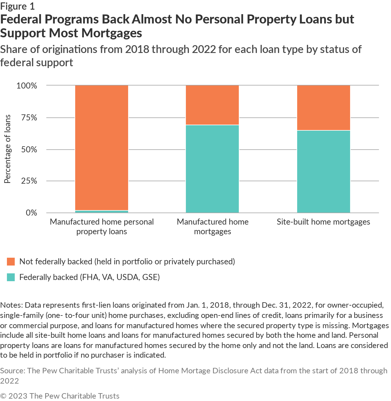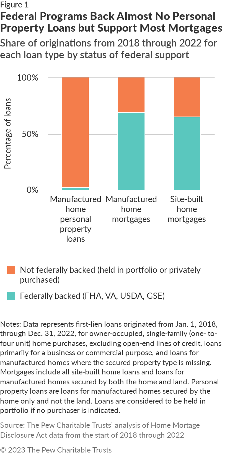 Federal lending supports play a critical role in creating a competitive mortgage market made up of thousands of lenders, but nothing comparable exists for personal property loans. Without government backing, just five lenders made 78% of personal property loans from 2018 through 2022. The Pew Charitable Trusts’ analysis of data collected by the Consumer Financial Protection Bureau under the Home Mortgage Disclosure Act found that the federal government supported more than 6 in 10 mortgages—loans for both a home and the land beneath—originated between 2018 to 2022 for site-built and manufactured home purchases. Meanwhile, 2% of personal property loans those years received federal support. (See Figure 1.)