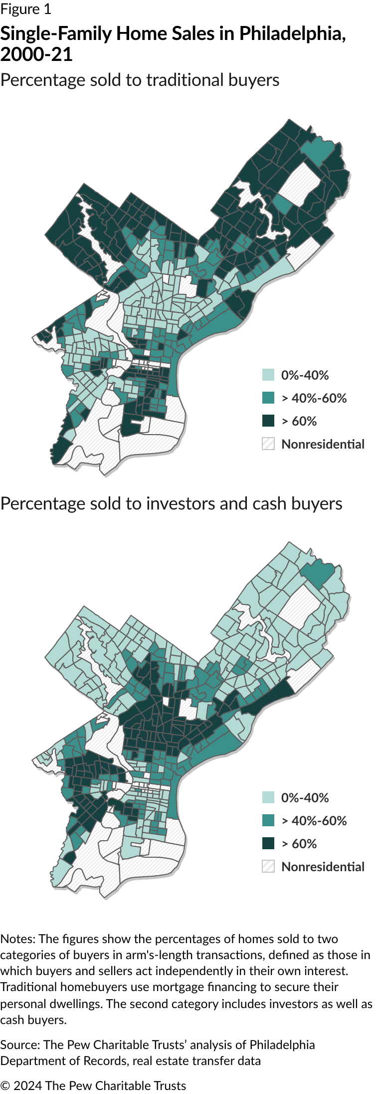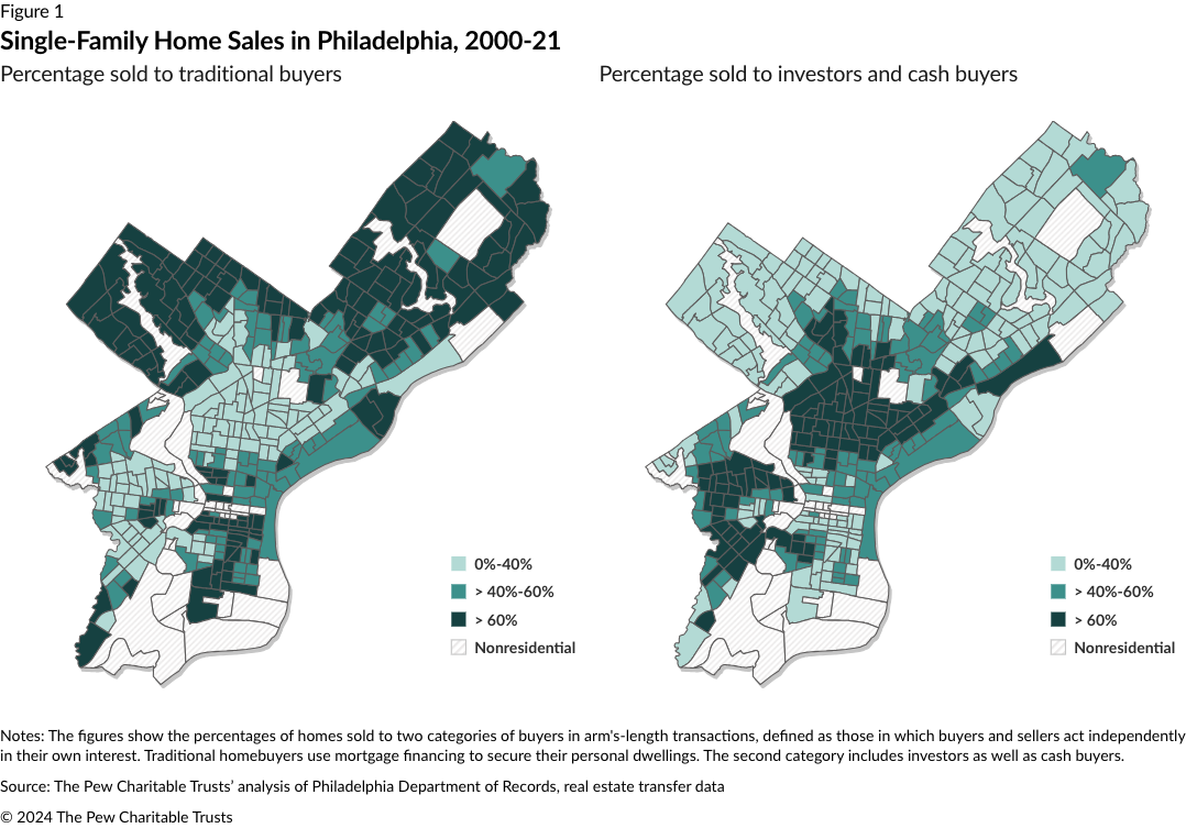 Of the 19,000 single-family home purchases made in Philadelphia in a typical year, investors account for about a third of them, according to an analysis of city records by The Pew Charitable Trusts. Moreover, investors tend to buy in different neighborhoods from those chosen by traditional buyers purchasing homes for themselves using a mortgage.