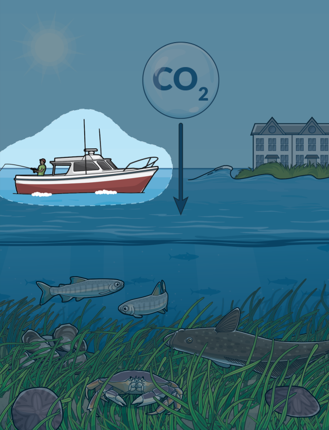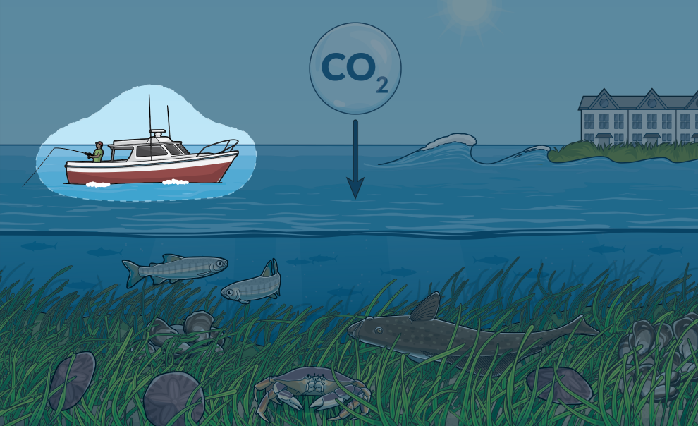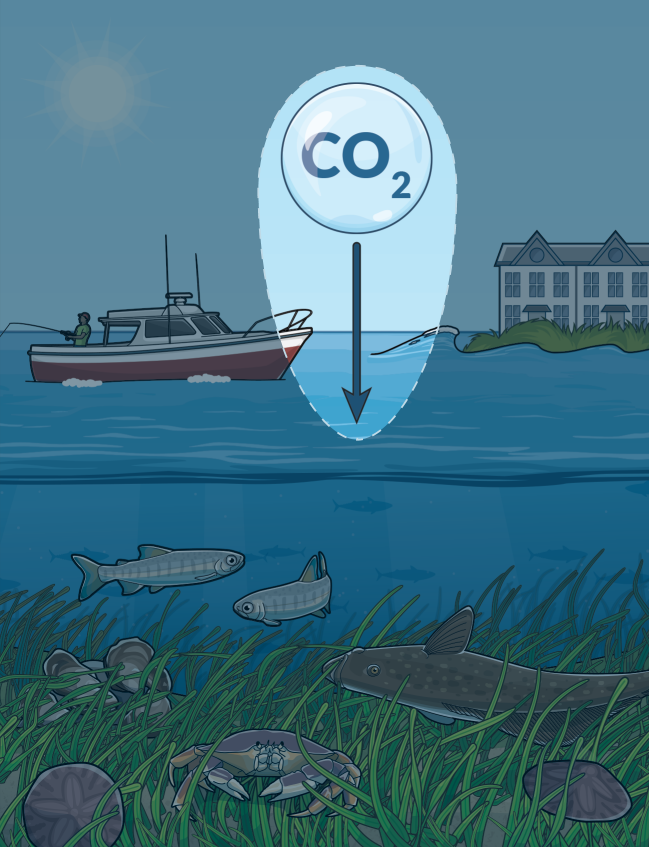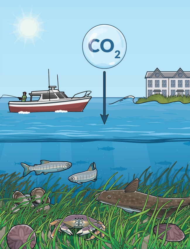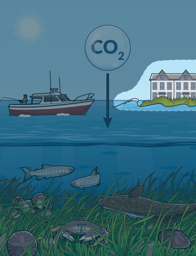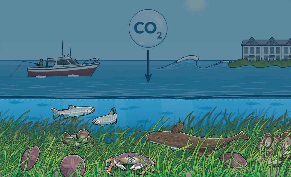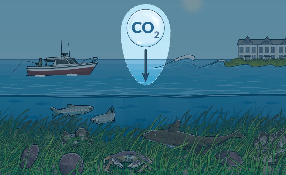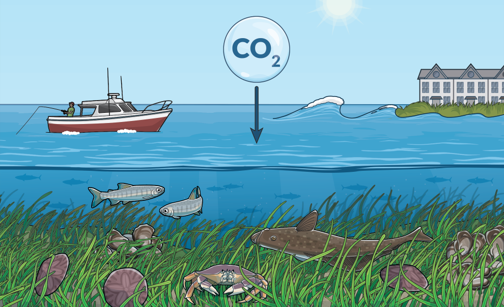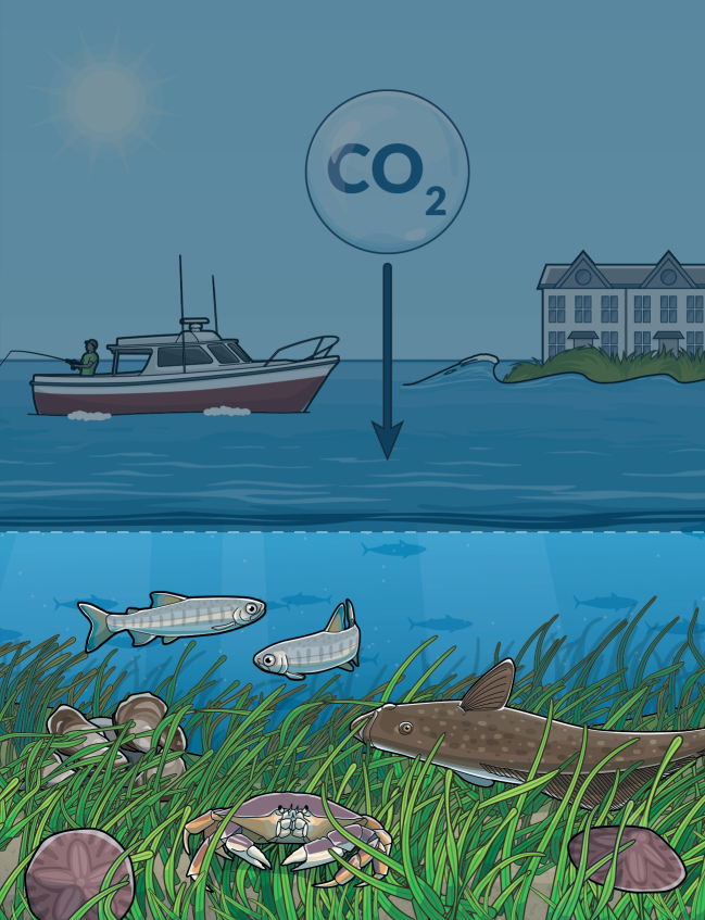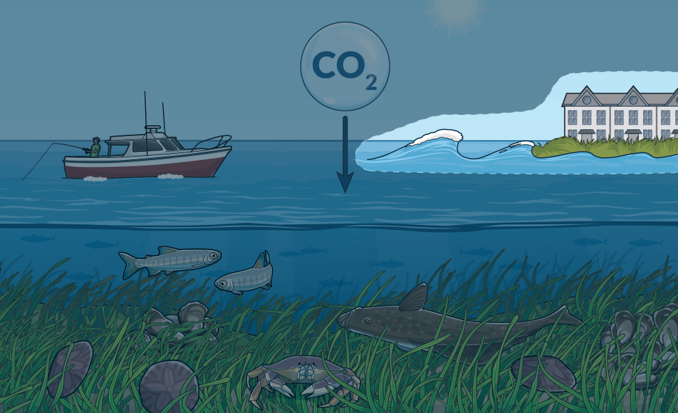 Eelgrass sequesters climate-warming carbon from the water and air in its leaves, roots, and underlying soils, and reduces ocean acidification—which inhibits shellfish growth—in surrounding waters.