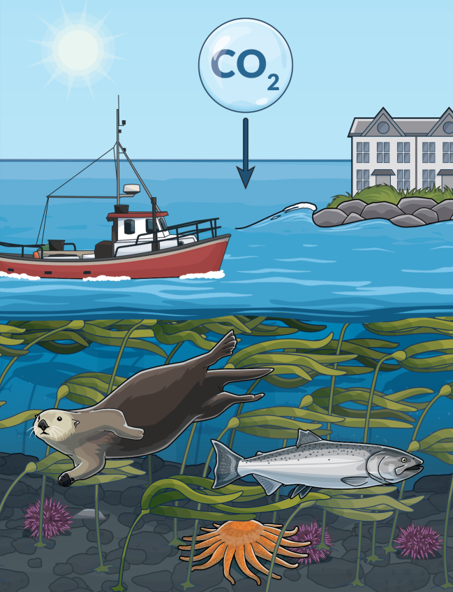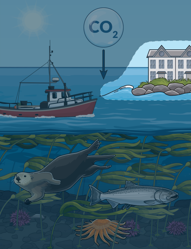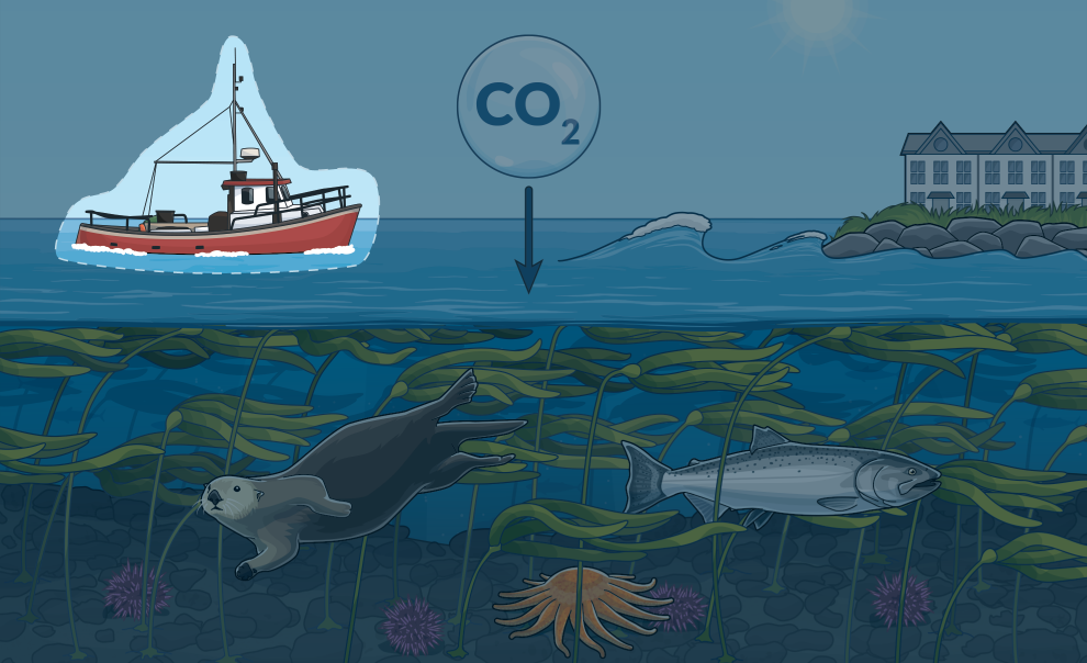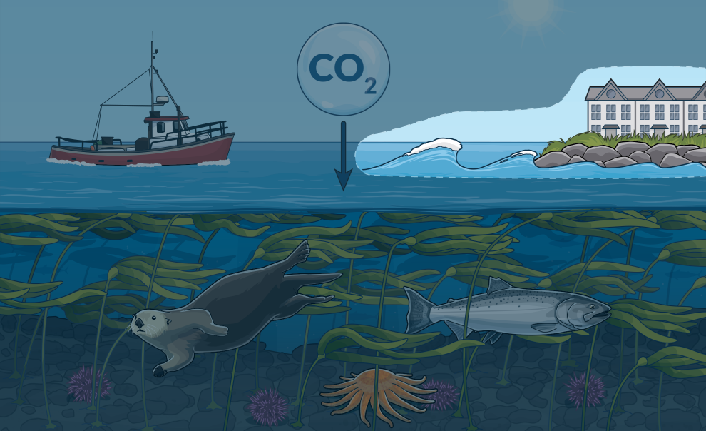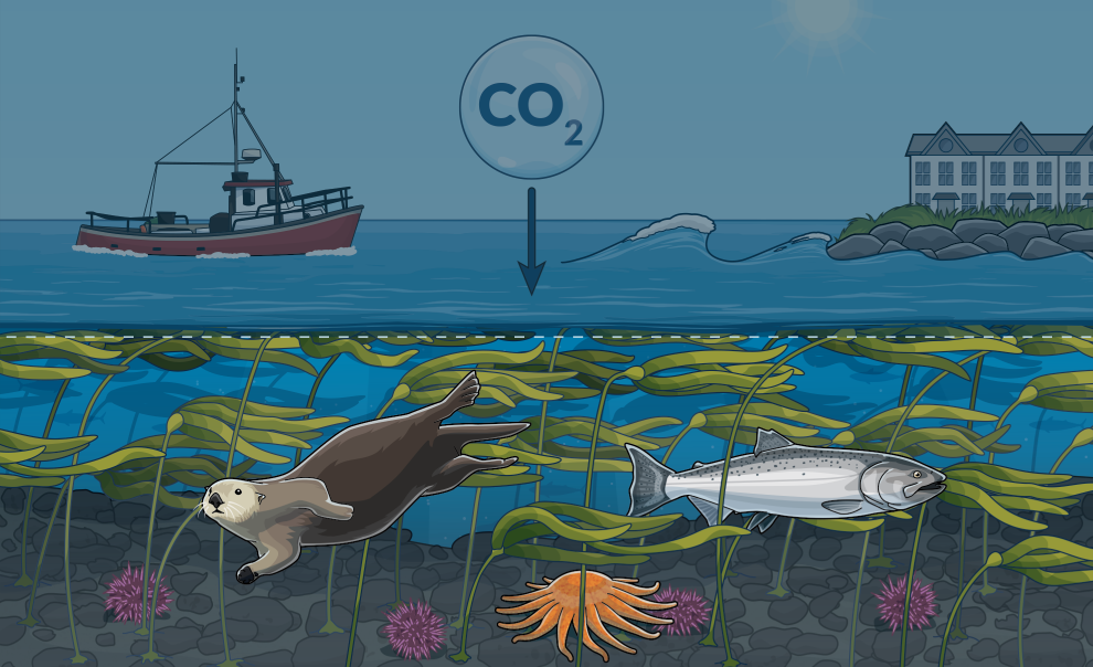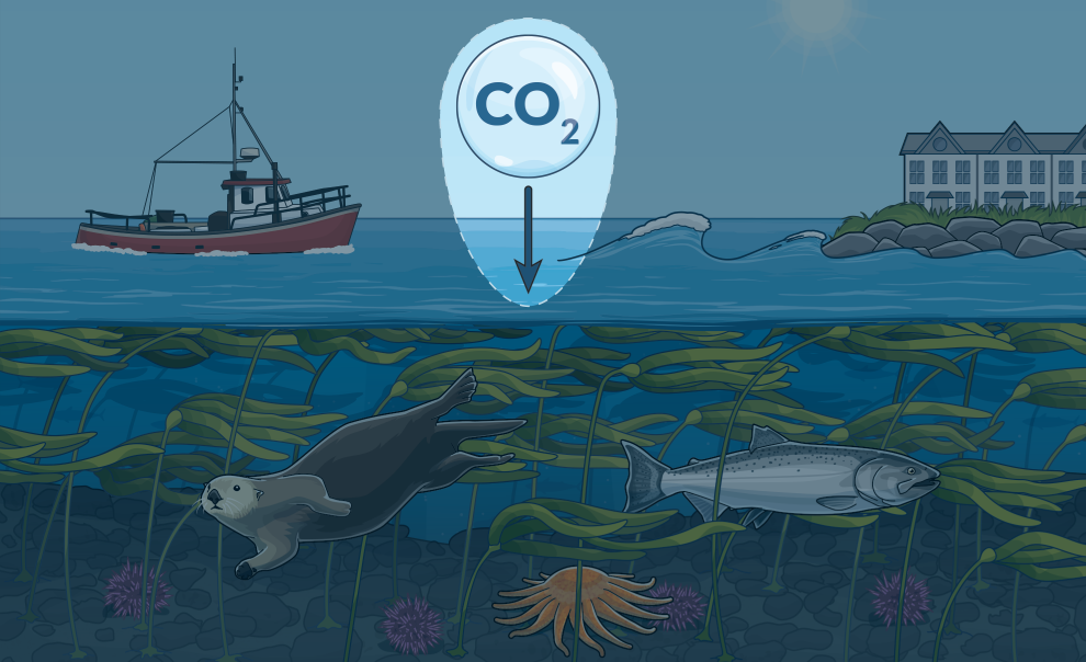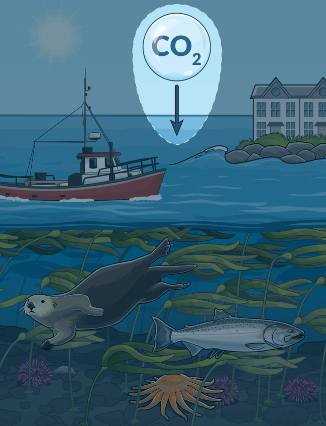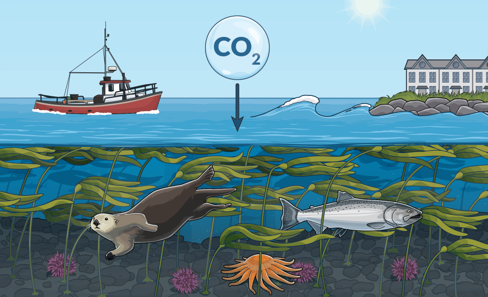 Kelp forests absorb carbon dioxide from the water and store it over the long term in the ocean floor after the kelp dies. Kelp also produces oxygen and can help reduce ocean acidification in surrounding waters, providing a refuge for important shellfish species such as crab and oysters.