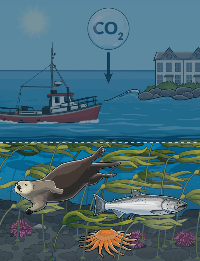 Kelp forests are one of the most productive marine ecosystems in the world. This canopy-forming algae can grow more than 2 feet a day, absorbing carbon dioxide as it grows and, in some cases, reducing the effects of ocean acidification in surrounding waters. It provides food, shelter, and nursery areas for an array of marine life, including otter, salmon, rockfish, shellfish, sea stars, and other invertebrates.