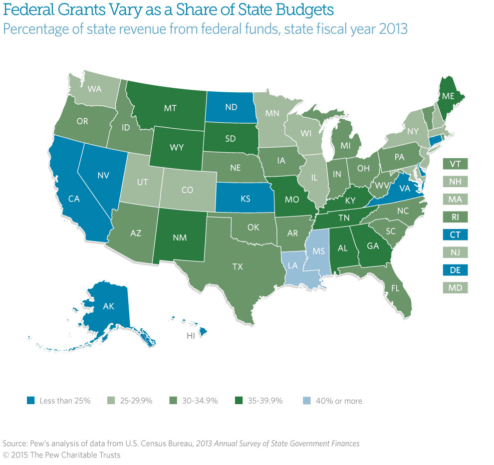 States receive federal grants to help fund programs in areas ranging from education to transportation to health care. Federal grants accounted for an average of 30 percent of total state revenue in 2013, but states’ reliance on this revenue source varies widely. At nearly 43 percent, Mississippi had the largest share of revenue from federal grants, while North Dakota had the smallest at 19 percent. (See "Federal Funds Provide 30 Cents of Each Dollar of State Revenue" for state-specific data.)