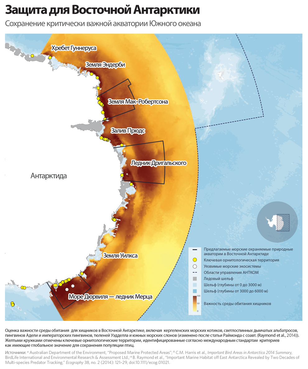 Новая морская заповедная зона «Восточная Антарктика» в Южном океане включит в себя Землю Мак-Робертсона, ледник Дригальского, море Дюрвиля — ледник Мерца и должна составить почти миллион квадратных километров. Эта территория предложена на рассмотрение АНТКОМ (Комиссии по сохранению морских живых ресурсов Антарктики, Commission for the Conservation of Antarctic Marine Living Resources (CCAMLR)). The Pew Charitable Trusts поддерживает создание заповедников, так как факты свидетельствуют, что они способствуют сохранению экосистем и восстановлению биоразнообразия. Морские заповедники позволяют смягчить влияние изменения климата на Мировой океан. В свою очередь, это поможет планете приспособиться к шести ключевым последствиям изменения климата: закислению океана, повышению уровня моря, увеличению интенсивности штормов, сдвигам в распределении видов, снижению биологической продуктивности и содержания кислорода в воде.