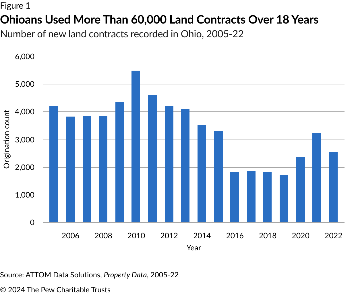From 2005 to 2022, homebuyers in Ohio entered into more land contracts than in almost any other state. Land contracts, also known as “contracts for deed” or “land installment contracts,” are an alternative form of home financing that does not involve banks or mortgage lenders. Instead, they involve the seller extending credit directly to the homebuyer, who then agrees to make regular payments over an agreed duration. Because a land contract is a direct negotiation between buyer and seller, terms can be more flexible than those for mortgages, which can help buyers who would not qualify for a mortgage, access credit.1 Survey data shows that many land contract buyers report ultimately attaining homeownership.2