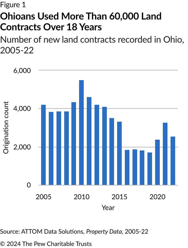 Land contracts are common in Ohio. From 2005 to 2022, county governments recorded 60,537 land contracts in the state—the second-most among all states. The number of land contract recordings peaked in Ohio in 2010 and has generally tended to rise and fall in line with national trends. (See Figure 1.)