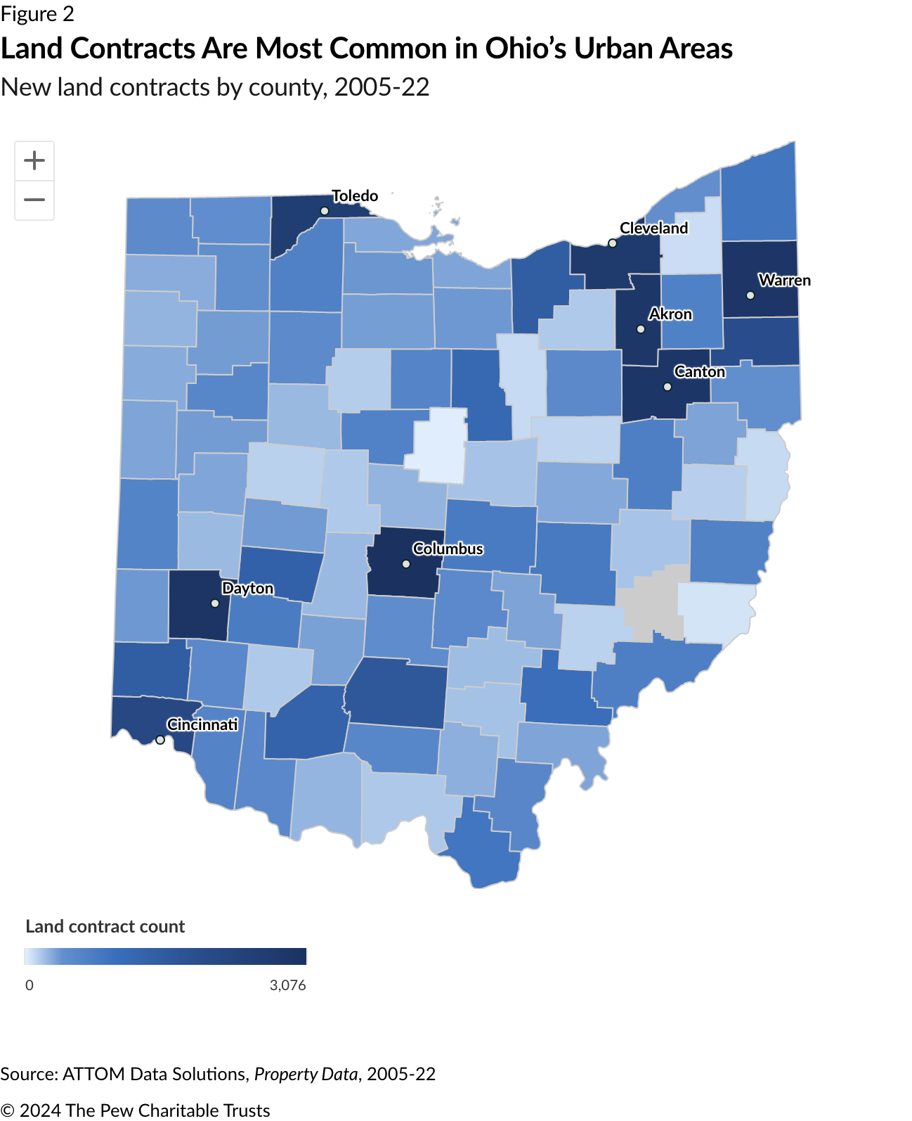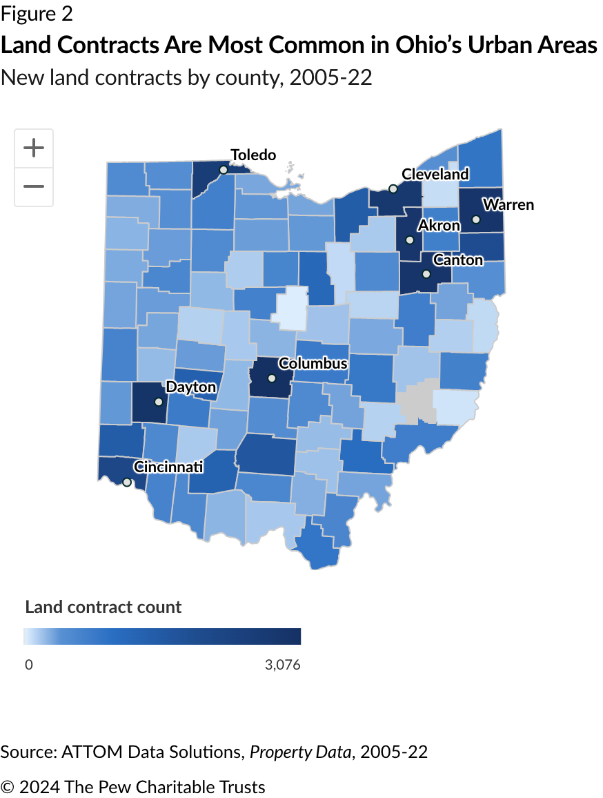 Land contracts are most common in urban areas. Franklin County, which contains Columbus, recorded 3,076 land contracts, the most in the state. Land contracts were also prevalent in Montgomery County, home to Dayton (2,967); Trumbull County, where Warren is located (2,922); and Stark County, which contains Canton (2,889). (See Figure 2.)