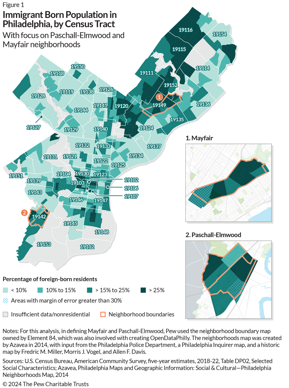 The Pew Charitable Trusts set out to learn more about the city’s immigrants by examining neighborhoods whose foreign-born populations have grown significantly: Mayfair in the Lower Northeast and Paschall-Elmwood in Southwest Philadelphia, each with about a quarter of residents born abroad. (See Figure 1.) The percentage growth of foreign-born residents in these neighborhoods far exceeds the citywide rate. (See Table 1.)