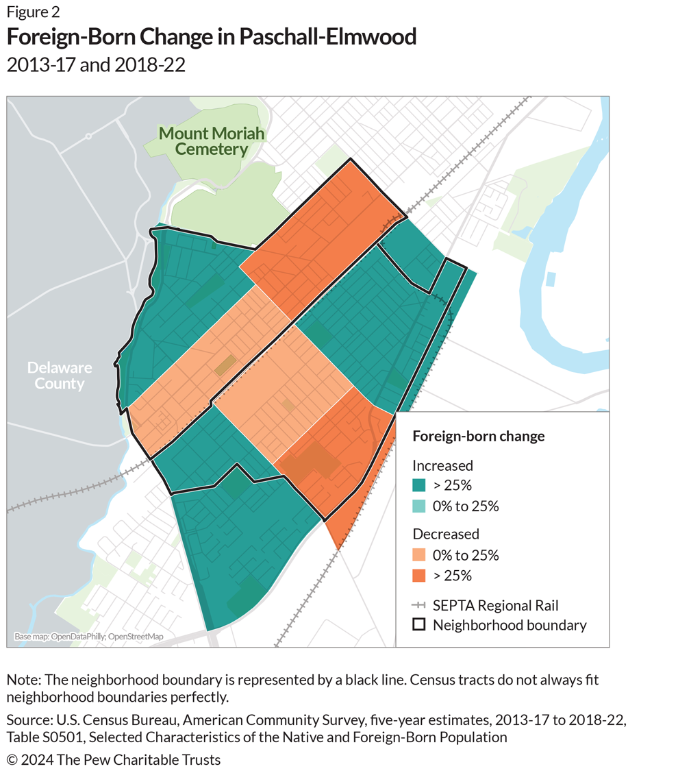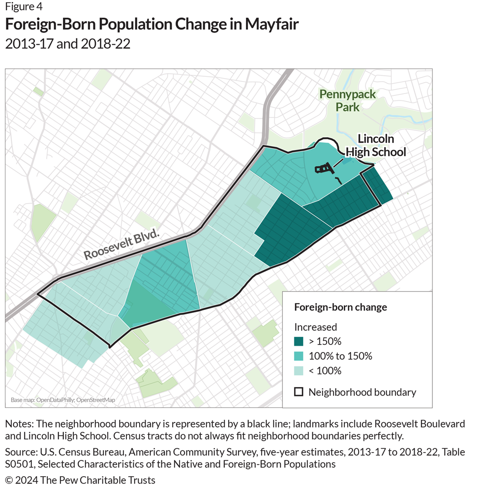 These neighborhoods have a higher percentage of foreign-born residents—and a larger percentage increase from 2013-17 to 2018-22—than the city as a whole. One of many major distinctions is that Mayfair has recently become a popular destination for immigrants, while Paschall-Elmwood has drawn immigrants for several decades.