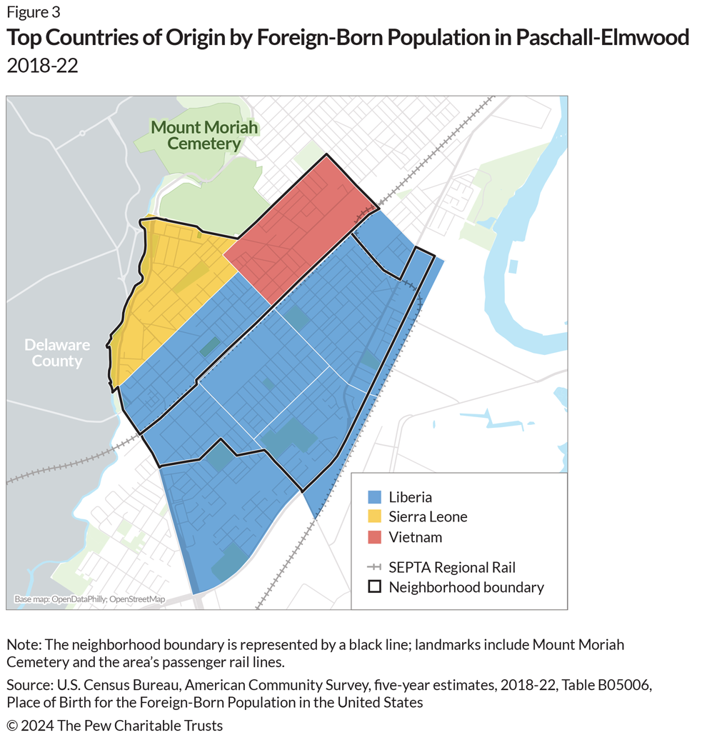 Elmwood has historically attracted immigrants from Vietnam, Cambodia, and various African countries. A concentration of Vietnamese immigrants lives in the northeast corner of the neighborhood, near Mount Moriah Cemetery and adjacent to a Sierra Leonean community. (See Figure 3.) Many Liberians, meanwhile, live on the opposite side of the Regional Rail tracks, in Elmwood, toward the Grays Ferry neighborhood.