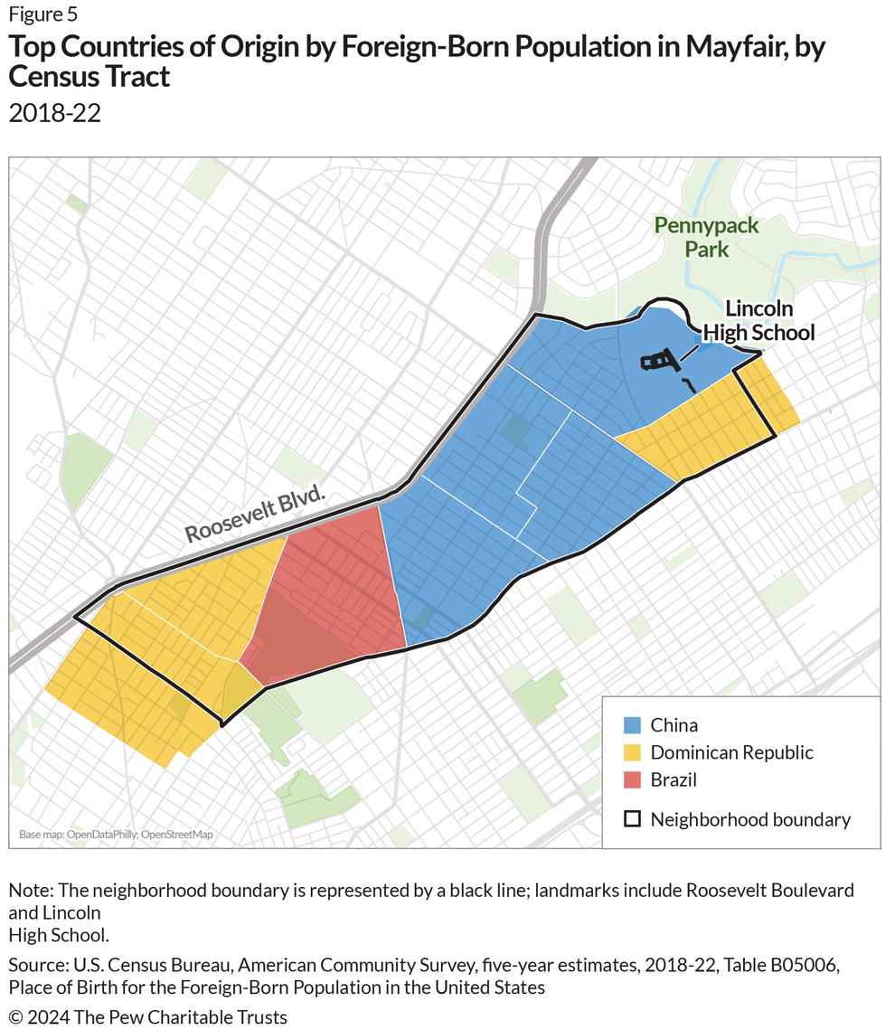 Among foreign-born residents in the 19149 ZIP code, 38.2% identify as Asian, 33.4% as Hispanic, 13.8% as non-Hispanic White, and 6.6% as Black or African American. China, the Dominican Republic, Brazil, Venezuela, and Vietnam are the top five countries of origin for Mayfair’s foreign-born population. (See Table 3.)