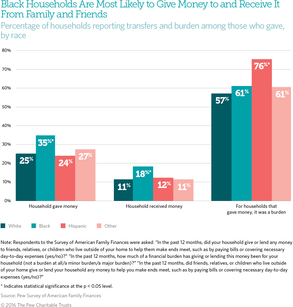 Black households were significantly more likely to provide assistance to those outside their immediate family (35 percent) than were white (25 percent), Hispanic (24 percent), or other households (27 percent).6 The frequency of transfers across black households is quite high: One-quarter reported giving money to a friend or relative more than once in the past year. Black households also report receiving help (18 percent) more than other households (11 percent).7 However, black households did not report the greatest burden with respect to giving or lending money. Rather, it was Hispanic households, among whom three-quarters of those who gave help felt burdened by doing so.8