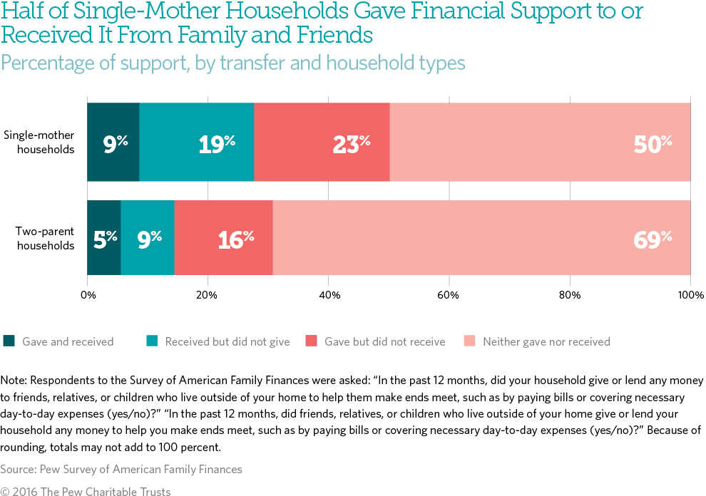 Single mothers are more likely than two-parent households to receive money from and owe loans to friends and family. Single mothers are often in a more precarious financial state, and accordingly have more social and financial pressures because of their reliance on social networks and having few alternatives for monetary or other support.16