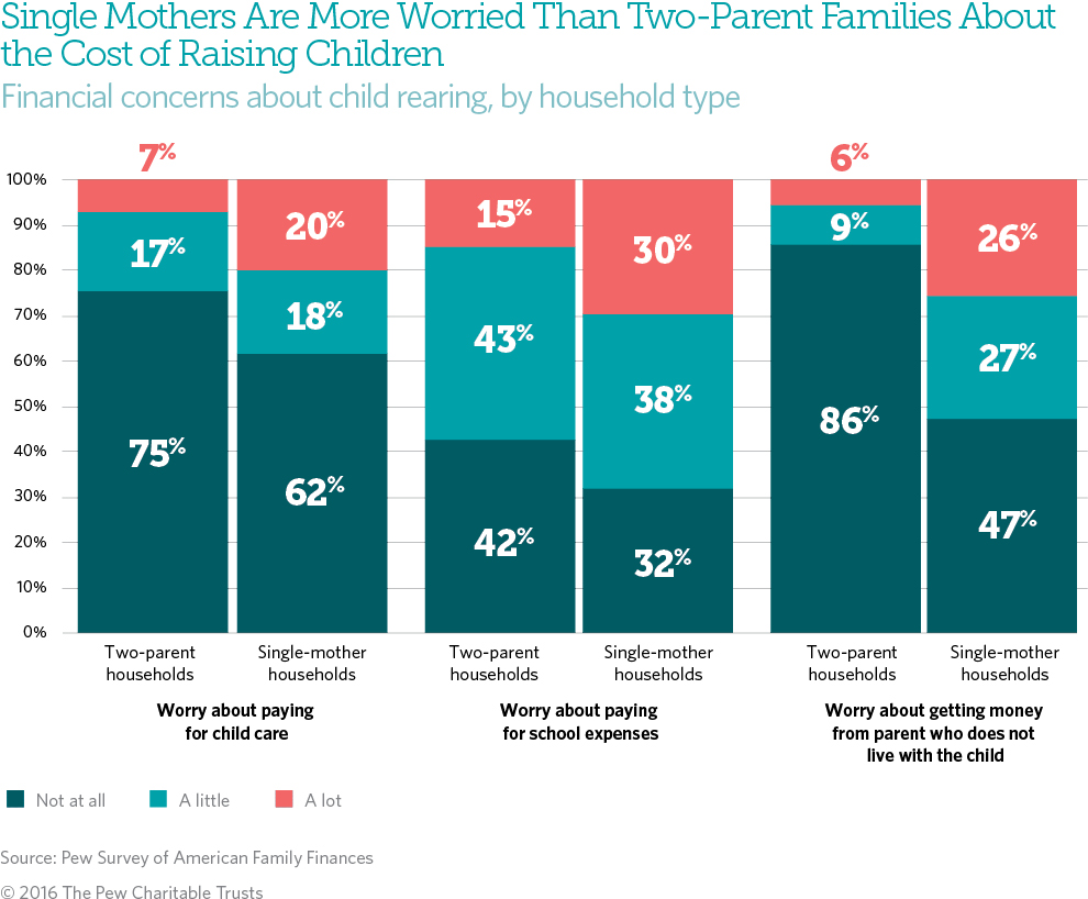 Single mothers also rely heavily on relatives for child care and report anxiety about the costs of raising children. Although single mothers receive regular no-cost child care at similar rates as two-parent households (9 percent), three times more single mothers have moved closer to relatives to access that child care help, compared with two-parent families (21 percent versus 7 percent, respectively). Single mothers are also more likely to say they worry “a lot” about paying for child care (20 percent) and school expenses (30 percent). (See Figure 4.) Onethird reported that the cost of raising children is a major source of stress.