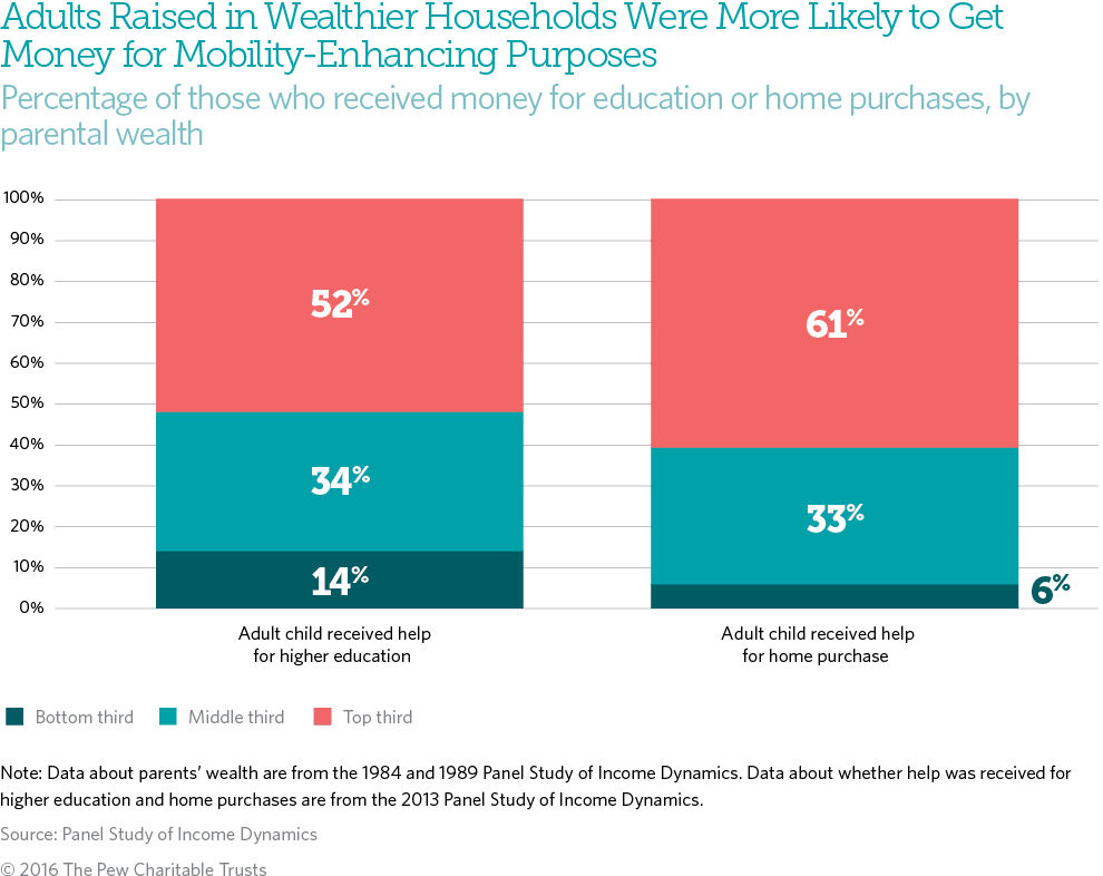 - Conversely, wealthy households are the most likely to receive transfers that boost their mobility or encourage even more wealth building. Among adults who received help for higher education or a home purchase, most were raised in the wealthiest households (52 percent and 61 percent of recipients, respectively) and had much healthier balance sheets. This suggests that family wealth advantages often convey to the next generation through mobility-enhancing transfers.