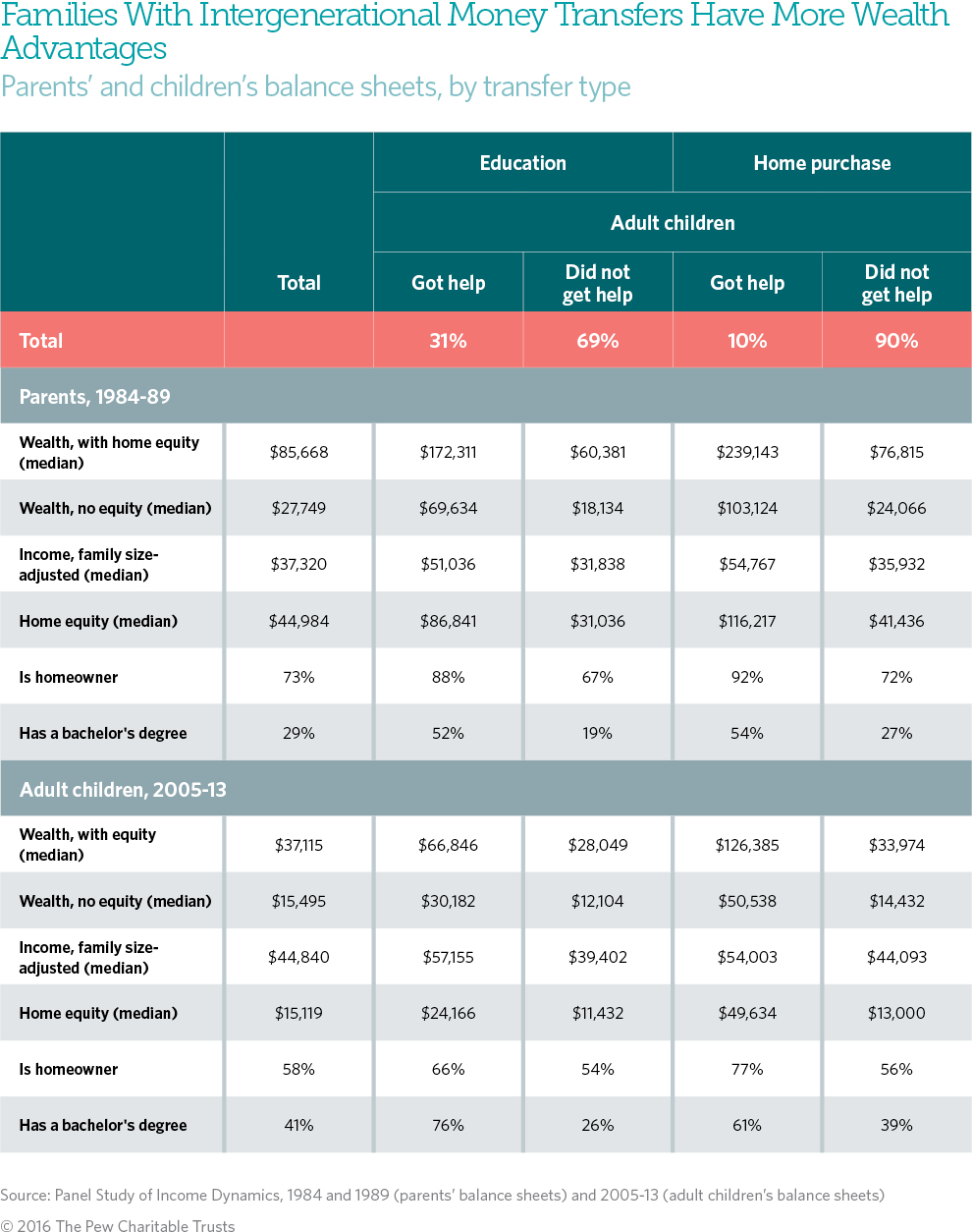 Adult children who received transfers of money from their parents also have healthier balance sheets on the whole than those who did not. Specifically, those who got help with education had 2.4 times higher total net worth, and those who received money to buy a home had 3.7 times higher total net worth than those who did not receive help. Their parents also had healthier balance sheets. Parents who provided money for education or homeownership in the 1980s had about three times the total net worth of their peers who did not give such transfers and were more likely to be homeowners, to be college-educated, and to have higher incomes. (See Table 1.)