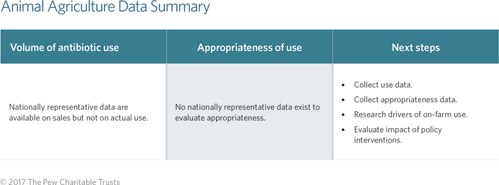 National data to evaluate the appropriateness of antibiotic use in animal agriculture are limited. The U.S. Department of Agriculture (USDA) collects nationally representative survey data on animal health, management practices, and productivity. However, the data are collected infrequently (about every five years), and surveys differ widely across species.20 Additional limitations include insufficient quantitative information on reasons for use, and specific drugs, dosages, and duration.21 Without such information, it is difficult to determine why antibiotics are used in U.S. animal agriculture, which uses are appropriate, and where alternatives to antibiotics might be used.