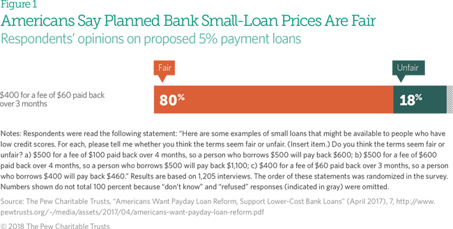 - The Pew Charitable Trusts, “Americans Want Payday Loan Reform, Support Lower-Cost Bank Loans” (April 2017), 7, http://www.pewtrusts.org/~/media/assets/2017/04/americans-want-payday-loan-reform.pdf.