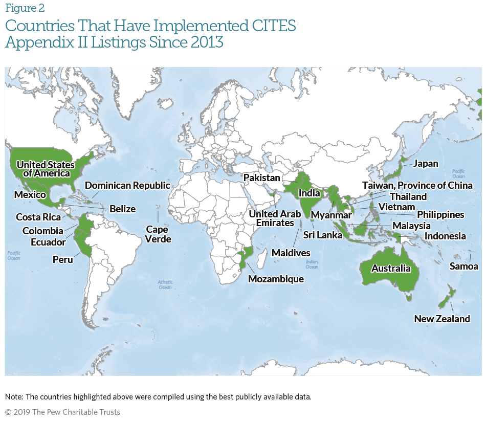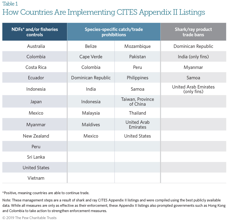 Countries can continue international trade in a species listed on Appendix II if they conduct an NDF that shows that the trade is legal and sustainable. Sri Lanka, New Zealand, and Indonesia, among others, have done that, making use of new, freely available electronic tools. Other countries—such as Cape Verde, the Philippines, and the United Arab Emirates—have prohibited the export or catch of all or some CITES-listed shark species. Still others, such as India, have put in broader measures, such as prohibiting the export of shark fins. Some governments, including most recently Samoa and the Dominican Republic, have gone even further, prohibiting commercial fishing, possession, sale, and trade of shark and ray species and their products in their waters.