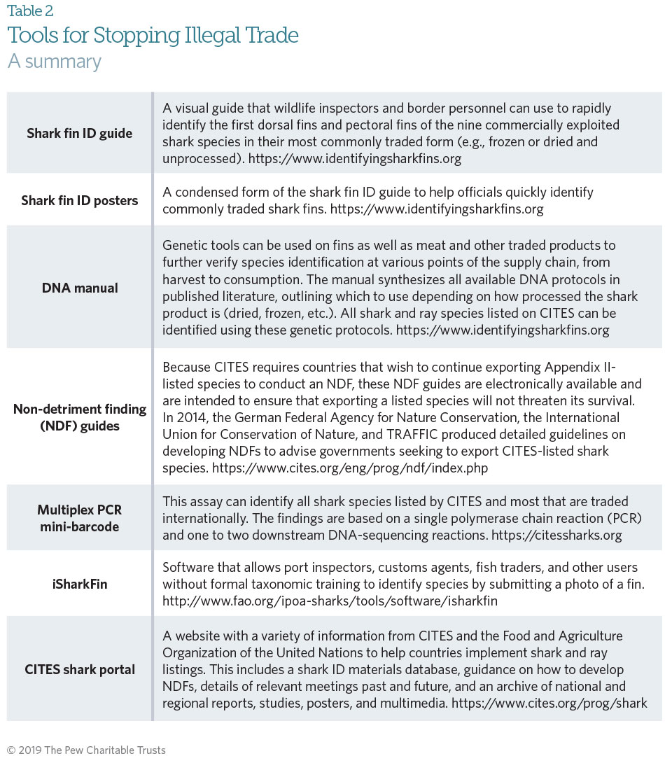 Through training, government officials from at least 70 countries have learned how to identify and stop illegal trade in CITES-listed shark and ray species. A wide range of tools is available in multiple languages, including shark fin identification guides and posters, to help governments ensure that continued trade in these species is legal, sustainable, and traceable. Table 2 provides a summary of these tools, many of which can be found at www.identifyingsharkfins.org or on the CITES shark portal.