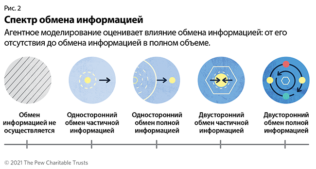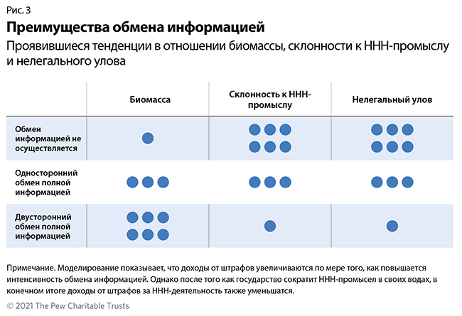 Решающее значение в борьбе с ННН-промыслом имеет обмен информацией между государствами о местонахождении судна, его разрешениях на промысел, месте ловли рыбы, истории владения им и о том, вело ли оно ранее незаконный или вредоносный промысел. Однако имеются сложности с вовлечением государств в активную совместную работу и своевременный обмен информацией, включая необходимость финансовых затрат и отсутствие взаимности. Чтобы продемонстрировать вероятные последствия обмена информацией в реальном мире, CEBR разработал агентное моделирование, включавшее в себя пять сценариев, в рамках которых изменялись определенные параметры, такие как объем передаваемой информации, схемы санкций за нарушения, а также технологические, операционные и институциональные ограничения.