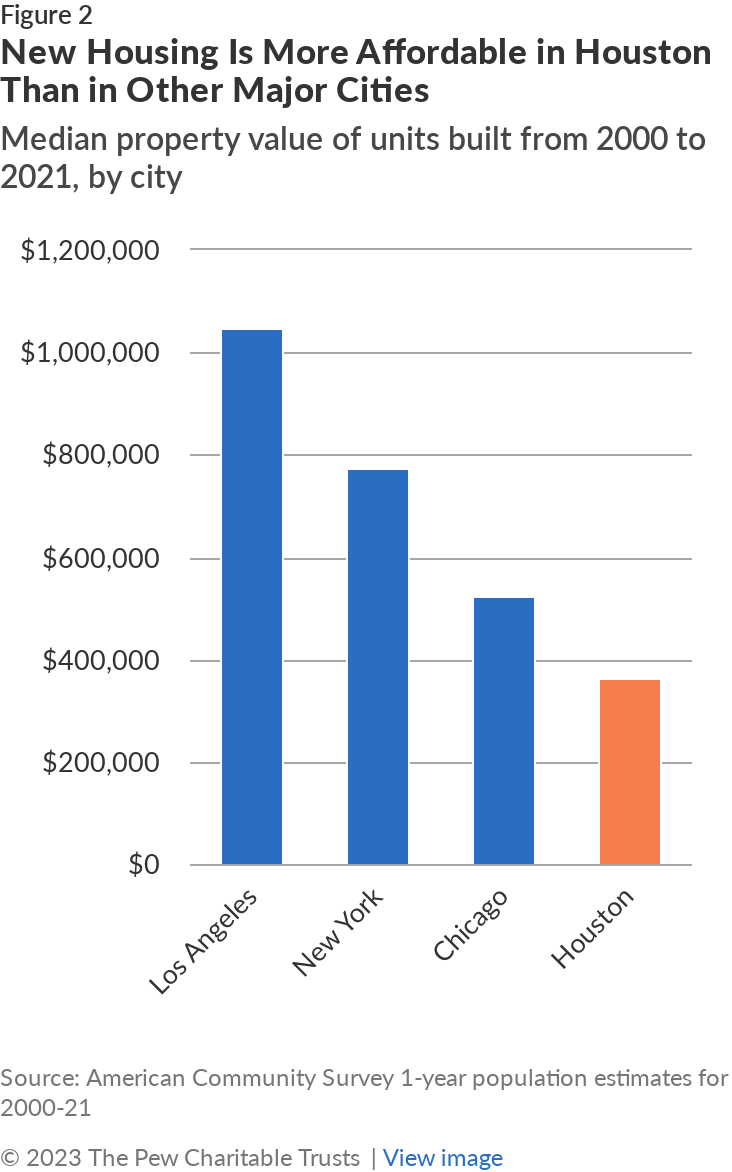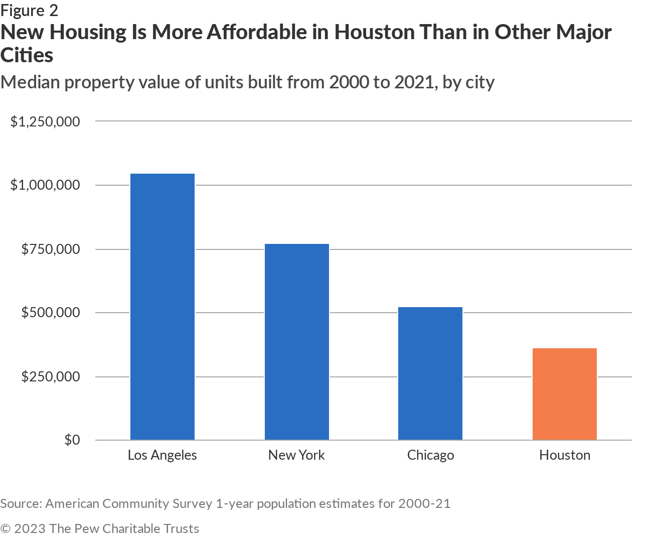 The SF2TH town houses are affordable not only by Houston’s standards but also compared with new housing construction in other major U.S. cities. According to data from the U.S. Census Bureau’s American Community Survey, homes built from 2000 to 2021 cost less in Houston than in the other three most populous cities in the United States. (See Figure 2.) This is partly because Houston has significantly lower land values than do Los Angeles and New York, enabling developers to acquire buildable lots more cheaply and pass savings along to homebuyers.3 But Houston’s relative affordability is also attributable to its land-use rules, which support denser housing construction in high-demand urban neighborhoods.