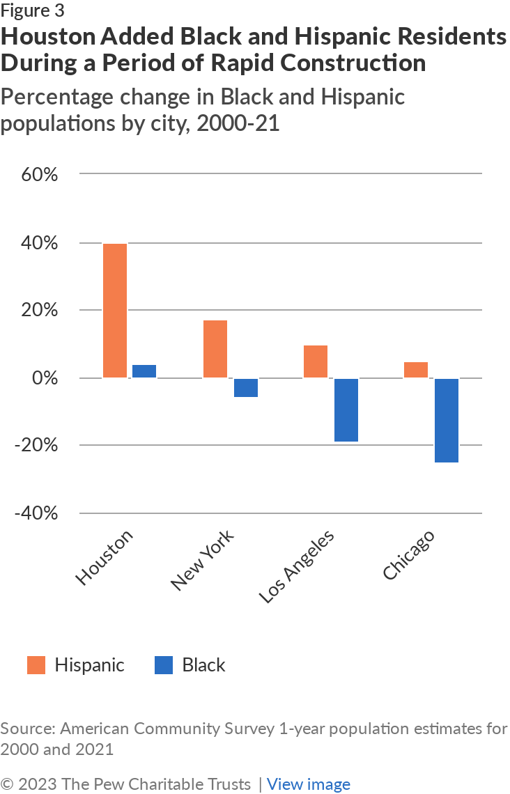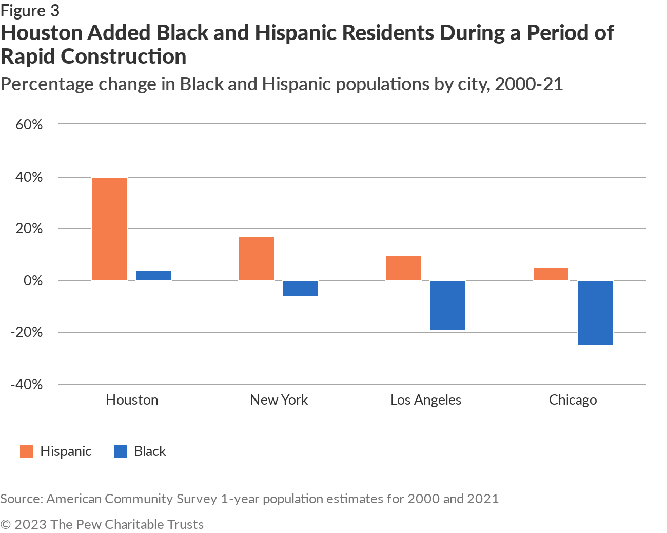 Furthermore, even with the localized increases in incomes and White residents, Houston’s reformed land-use policies appear to have contributed to greater racial and ethnic diversity in the city. From 2000 to 2021, Houston’s Black and Hispanic populations grew by 4% and 40%, respectively. In contrast, other major American cities experienced declines in their Black populations and more modest increases in their Hispanic populations during the same period. (See Figure 3.) Houston’s ability to expand its Black and Hispanic populations may be attributable to the affordable and ample housing options made possible by the city’s accommodating land-use policies.