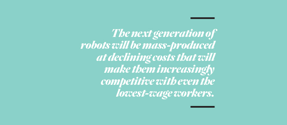 Boiled down to economic terms, the choice between employing humans versus buying and operating robots involves a trade-off in terms of expenditures. Human labor involves very little “capex,” or capital expenditures—upfront payments for buildings, machinery, and equipment—but high “opex,” or operational expenditures, the day-to-day costs such as salary and employee benefits. Robots come with a diametrically opposed cost structure: Their upfront capital costs are high, but their operating costs are minor—robots don’t get a salary. As the capex of robots continues to go down, the opex of humans becomes comparatively more expensive and therefore less attractive for employers.