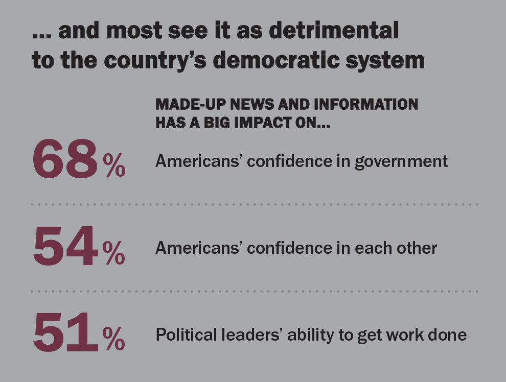 More Americans view made-up news as a national problem than terrorism, illegal immigration, racism and sexism, according to a Pew Research Center survey released in June. Nearly 7 in 10 adults say made-up news and information affects Americans’ confidence in government institutions and about half say it is having a major impact on our confidence in each other.