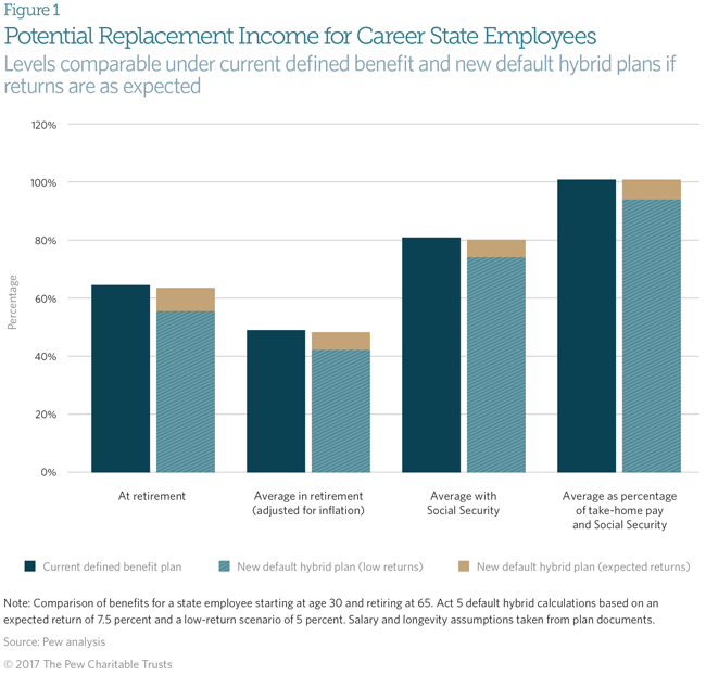 The new plan also continues to provide a path to retirement security for career workers in both state government and Pennsylvania’s public schools. On average, new workers can expect their retirement income to replace over 90 percent (including Social Security) of their final salary. Most research concludes that retirees will need 70 to 80 percent of pre-retirement income.