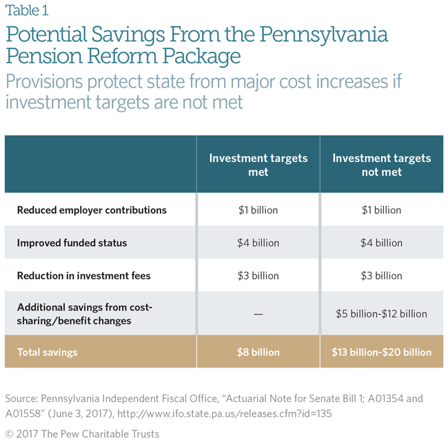 State analysts expect the reform package to save Pennsylvania taxpayers $8 billion to $20 billion over the next three decades, depending in part on the performance of plan investments. If the funds achieve their assumed rate of return, the state is projected to save $4 billion, and, in addition, improve its fiscal position by more than $4 billion over 30 years.