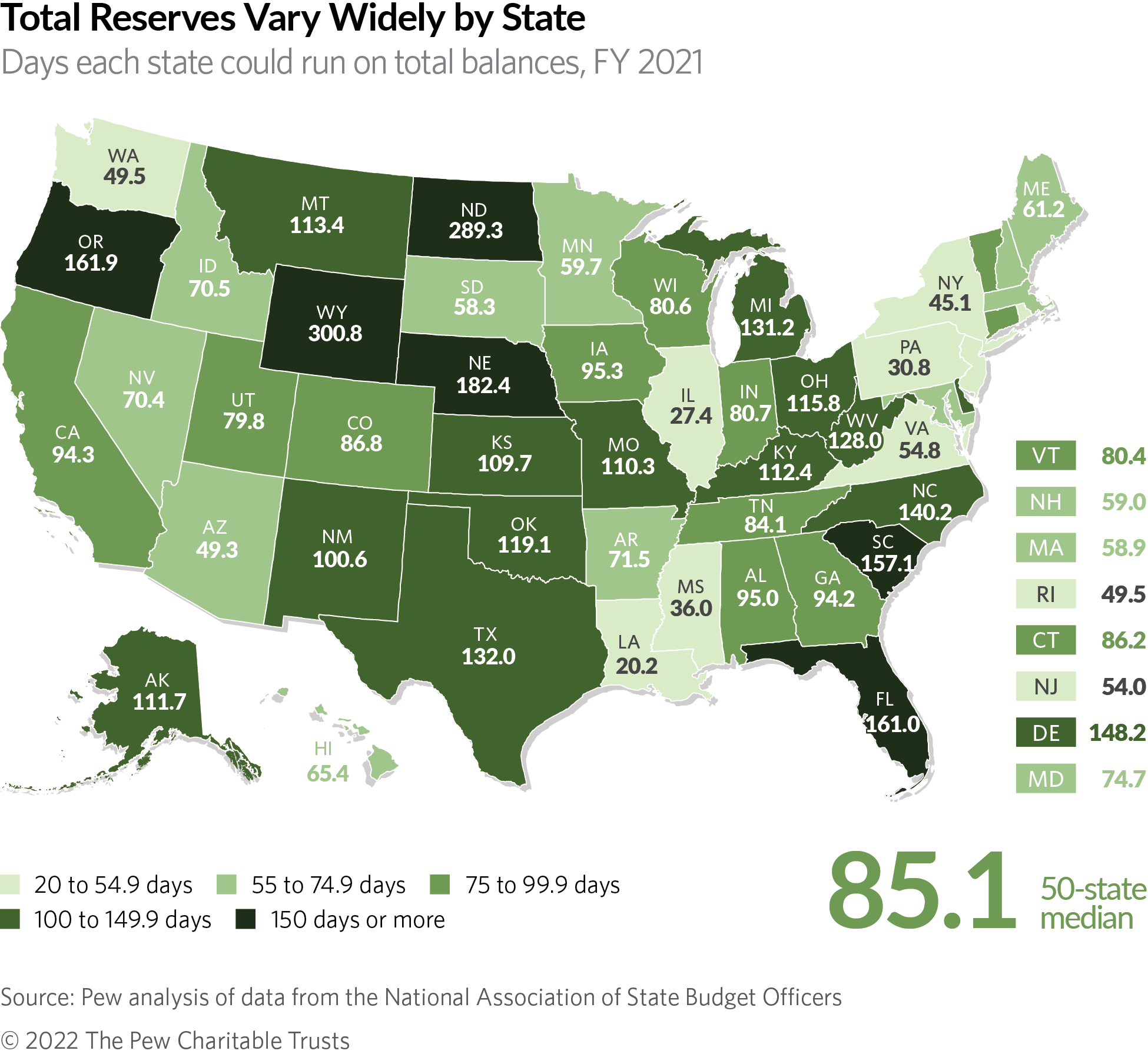 - The highest-ranked state for total balances was the same as for rainy day funds: Wyoming (301 days). Eighteen other states had total balances that could cover more than 100 days, a record high count compared with prior years when only a handful of states surpassed this benchmark.