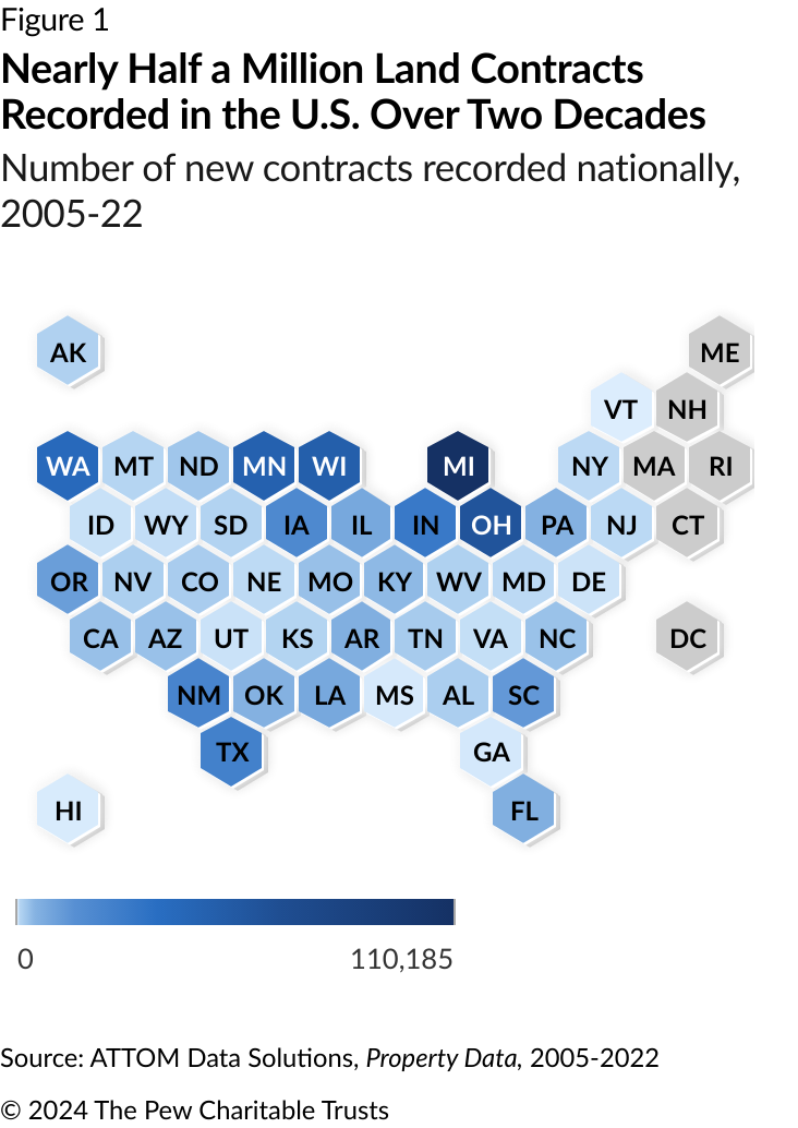 When land contracts are not recorded, buyers’ financial interest in a property is often not recognized or protected and they are often ineligible for common property tax exemptions and other government programs designed to benefit homeowners. In a nationally representative survey of land contract buyers conducted in 2022 for The Pew Charitable Trusts, just 78% of respondents indicated that their contracts were recorded. A separate analysis of property records data shows that 489,000 land contracts were recorded from 2005 to 2022, of which about 383,000 covered residential properties. (See Figure 1.) However, several states do not record any land contracts at all. The federal bill would address this by requiring sellers to record their land contracts with the local recorder of deeds office within five days of entering into the arrangement.