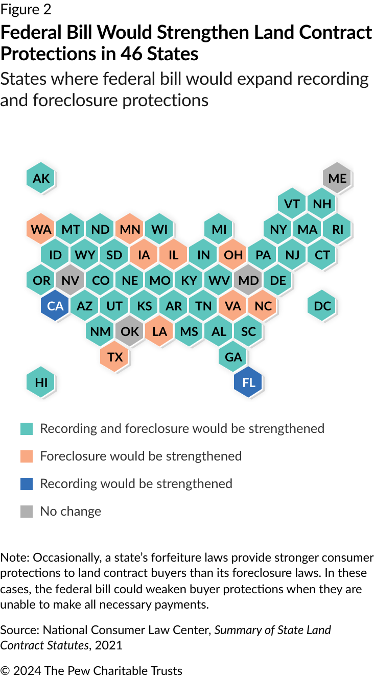 In states without land contract laws, policymakers have an opportunity to help buyers and sellers excluded from federal protection. Although the new bill would establish minimum standards, states can introduce new protections for land contracts or extend the federal bill’s protections to a wider group of buyers and sellers.