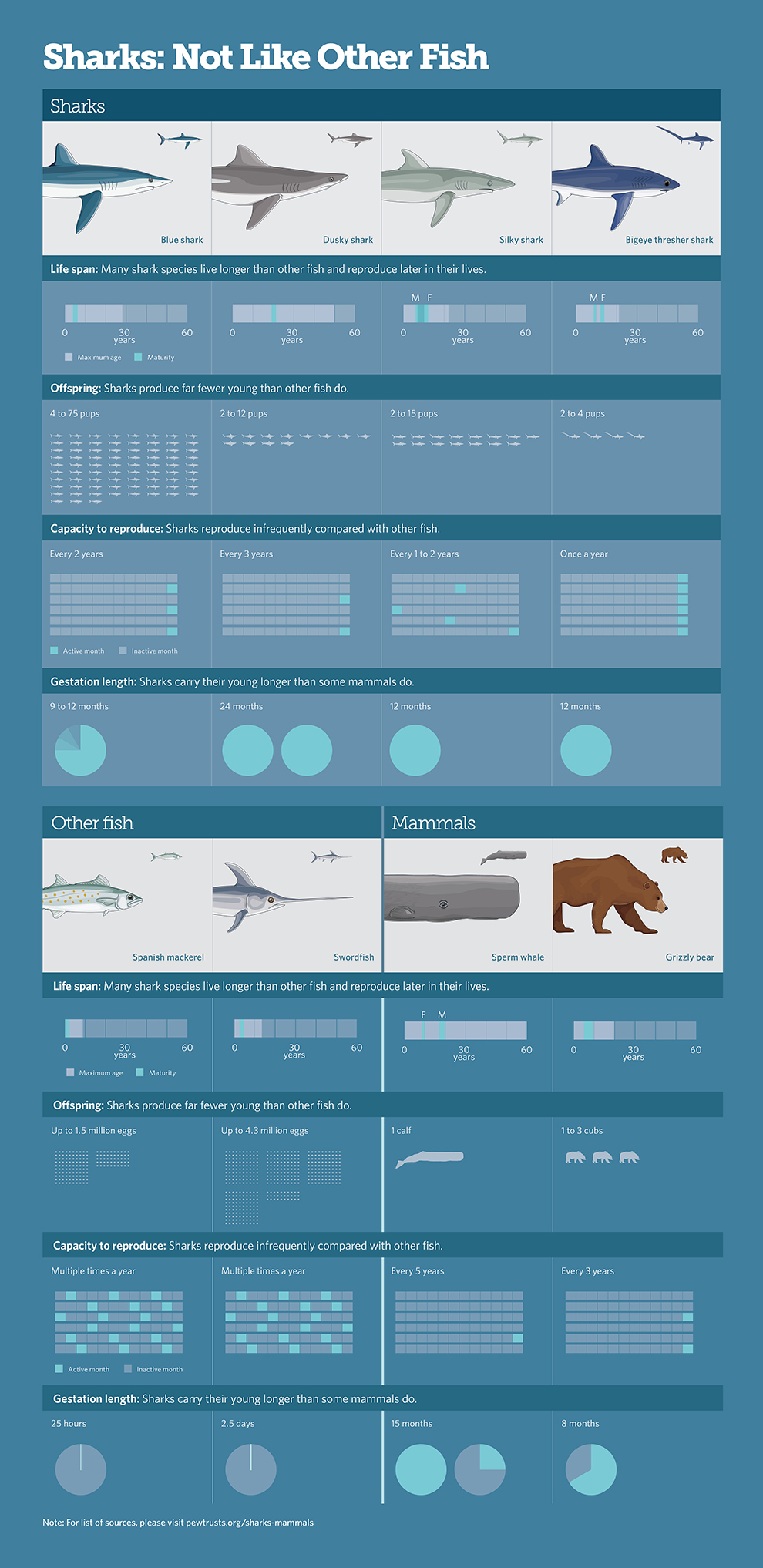 The life histories of many sharks are actually more similar to those of large mammals than to other fish. For example, the age at sexual maturity and gestation period of many shark species approximate that of large mammals.