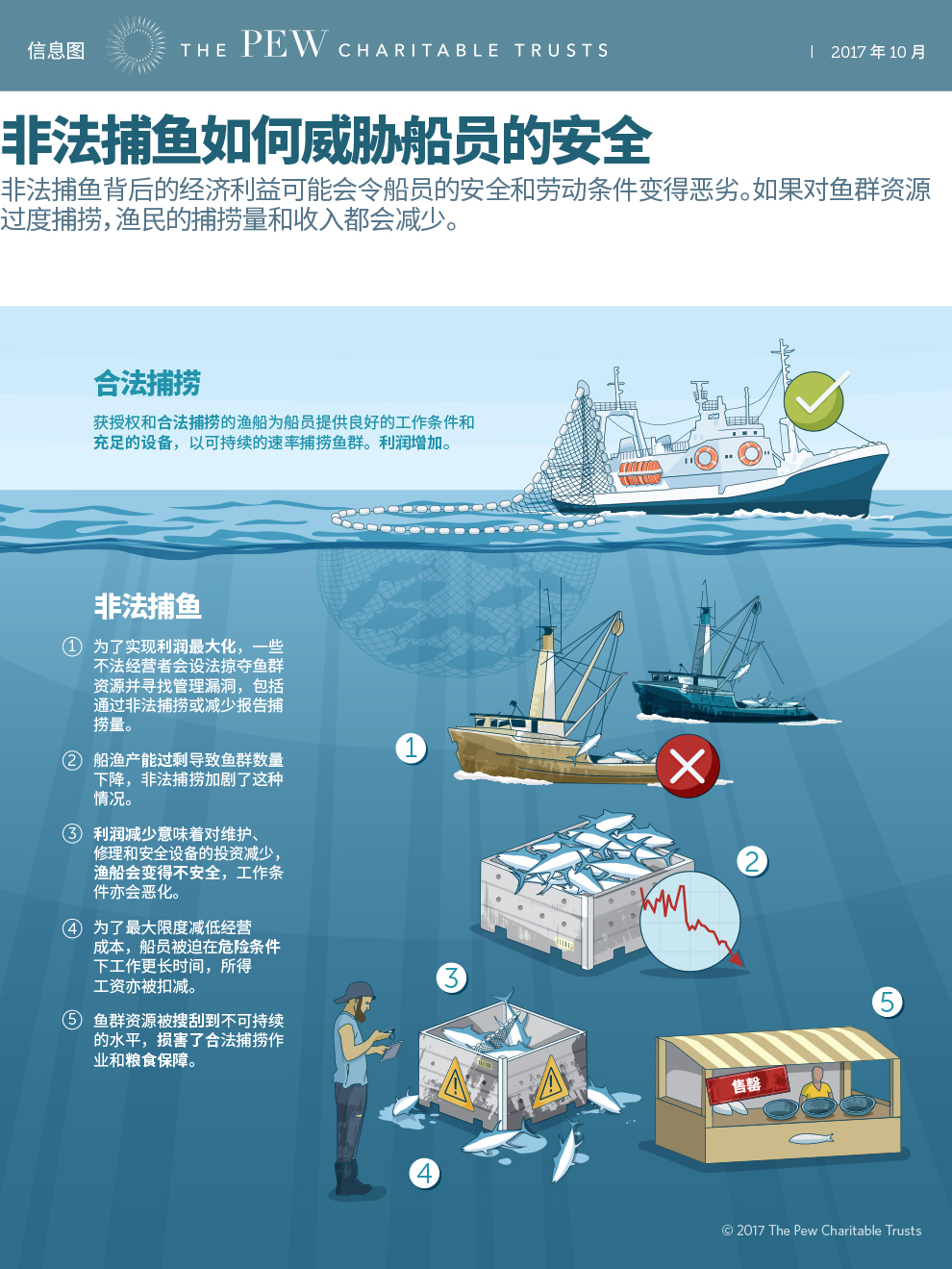 非法捕鱼背后的经济利益可能会令船员的安全和劳动条件变得恶劣。