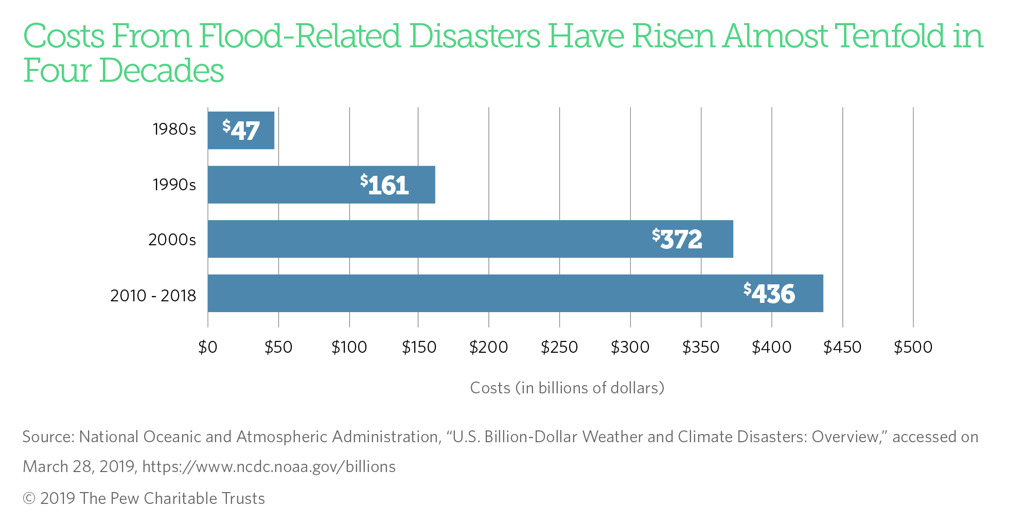 Losses and associated costs, however, have grown over the years. Costs from flood-related events have risen each decade since the 1980s, when the National Oceanic and Atmospheric Administration began tracking billiondollar major disaster events. Since 2000, the federal government has given states tens of billions of dollars to help rebuild public infrastructure after major flooding disasters.5