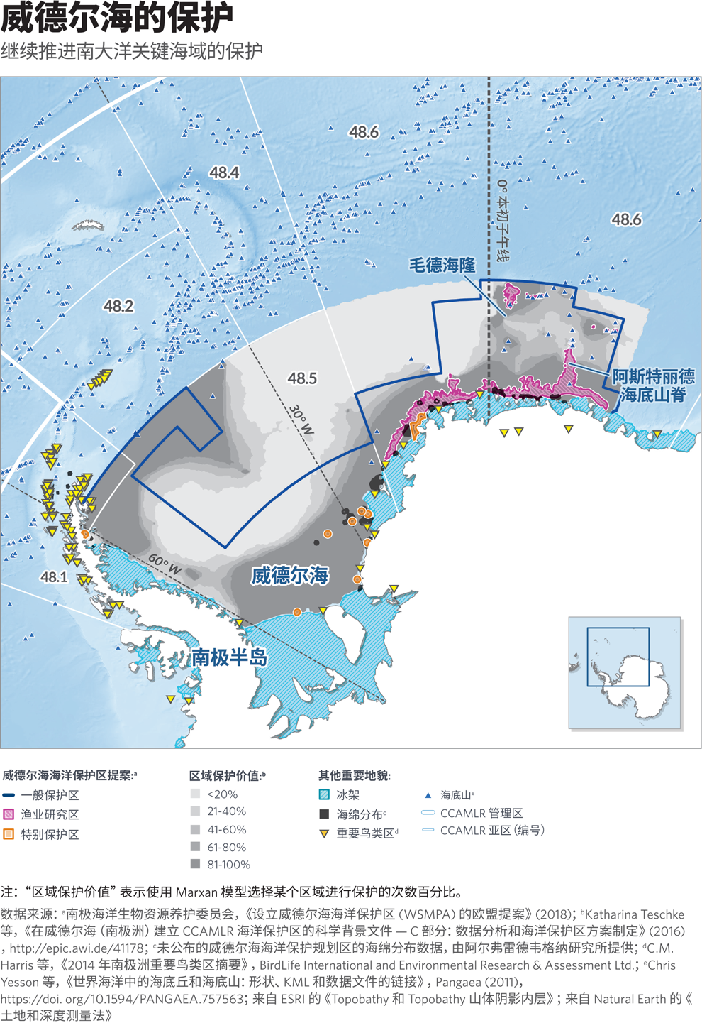 南极海洋生物资源保护委员会2始的海洋生态系统之一。这个独特的栖息地以丰富的生物多样性而闻名,包括南极鹱、帝企鹅和阿德利企鹅以及多种海豹和鲸类。在海面冰层下的深处,营养丰富的海底生态系统构成了许多独特生物,如玻璃海绵和冷水珊瑚等的主要栖息地。 百万平方公里)海洋保护区的提案。威德尔海是南极半岛东部一片被冰层覆盖的遥远海湾,也是世界上最原 (CCAMLR) 正在审议一项关于在威德尔海建立近 790,000 平方英里(超过