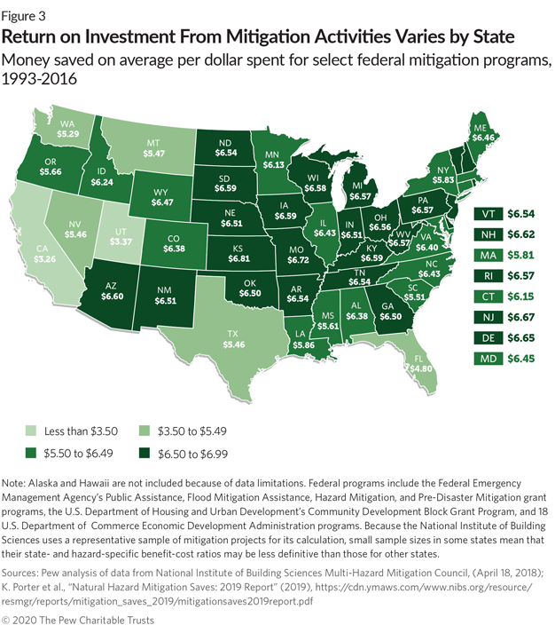 16. A. Stauffer, C. Foard, and E. Spence, “Data Highlight State-by-State Benefits of Federal Natural Disaster Mitigation Grants,” The Pew Charitable Trusts, June 17, 2019, https://www.pewtrusts.org/en/research-and-analysis/articles/2019/06/17/data-highlight-state-by-state-benefits-of-federal-natural-disaster-mitigation-grants.