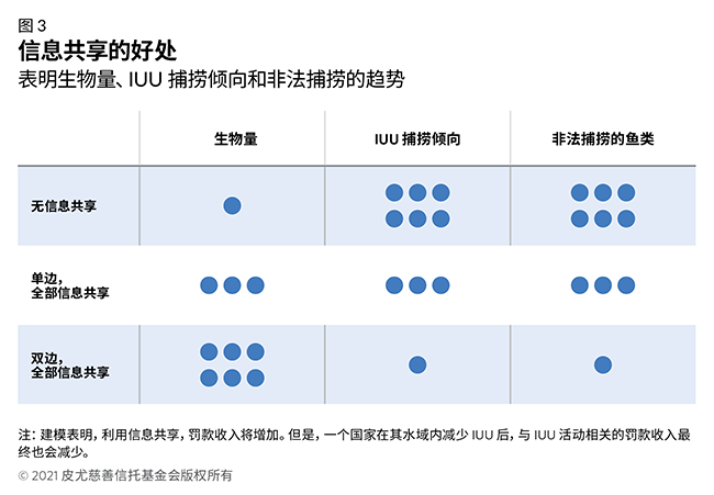 这些值得注意的调查结果为沿海国和港口国提供了领导机会。共享信息有可能积极改变渔民的行为,提高共 享渔业的生产力,并展现打击 IUU 捕捞和改善海洋治理的意图。根据这一模型,如果相邻国家共享全部信息, 这些好处可能会成倍增加。