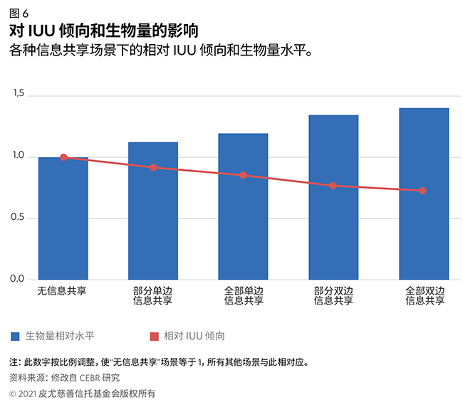 除了表明发现 IUU 捕捞的可能性增加和在港口上岸的非法捕捞鱼类的份额减少外,该模型还展现了 IUU 倾向 和生物量之间的显著趋势(图 6)。IUU 捕捞水平与渔业健康之间自然存在着关系:在每个建模的场景中,如果 潜在非法运营减少,生物量就会相应增加。这一结果很可能是因为信息共享有助于当局更好地管理渔业,使他 们能够制定和实施可持续捕捞配额等措施。当两个国家之间共享全部发现信息时,两者的关系最明显。