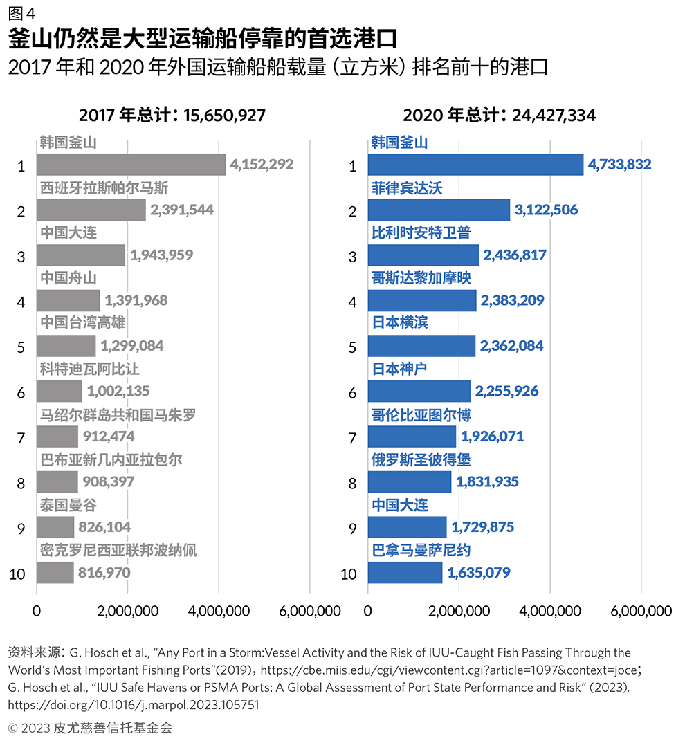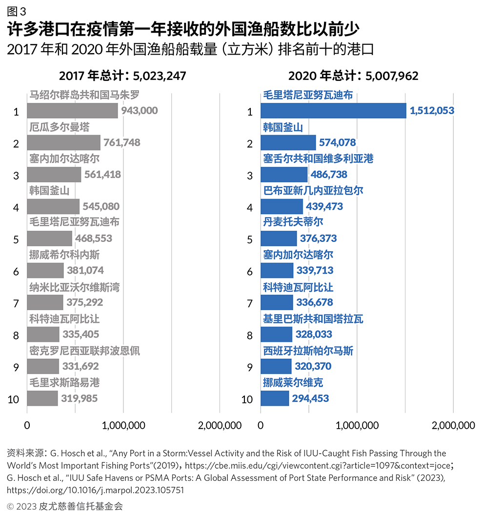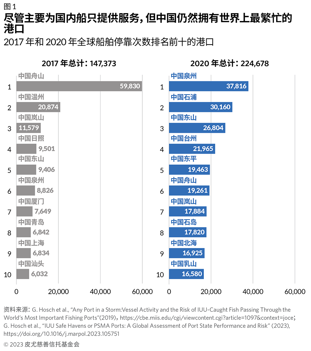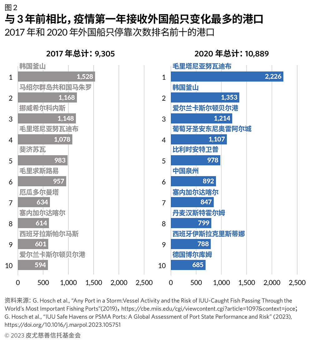 资料来源:G. Hosch et al., “Any Port in a Storm:Vessel Activity and the Risk of IUU-Caught Fish Passing Through the World’s Most Important Fishing Ports”(2019),https://cbe.miis.edu/cgi/viewcontent.cgi?article=1097&context=joce;G. Hosch et al., “IUU Safe Havens or PSMA Ports: A Global Assessment of Port State Performance and Risk” (2023), https://doi.org/10.1016/j.marpol.2023.105751
